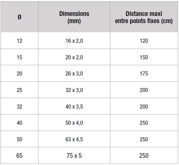 Les colliers de fixation du tube doivent être fixés au support, en respectant un écartement maximal (qui est fonction du diamètre nominal du tube).