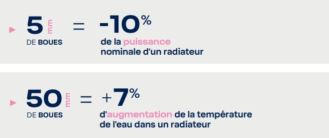 En cas de boues, la surface d’échange avec l’air ambiant d’un radiateur se réduit, ce qui entraîne une baisse de sa puissance nominale. Cette baisse de puissance est compensée par l’augmentation de la température de l’eau qui implique une surconsommation d’énergie.