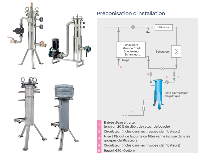 Installé en dérivation sur le retour du circuit (prévoir entre 15 et 30% du débit de circulation), de préférence en point bas de l’installation, les Filtres et Groupes Clarificateur BWT s’installent :