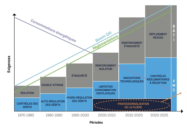 La ventilation intervient sur les aspects énergétiques du bâtiment : Qualité d’air intérieur (QAI) et Confort pour les occupants (thermique, acoustique…)