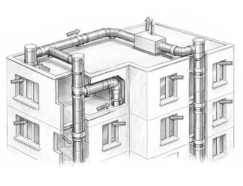 Le caisson d'extraction se situe généralement dans les combles. La régulation du débit d'air extrait est assurée sur le piquage du groupe d'extraction.