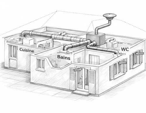 L'air vicié est évacué par des bouches d'extraction situées dans les pièces de service (cuisine, salle de bain, WC…) et adaptées aux besoins de ces pièces.